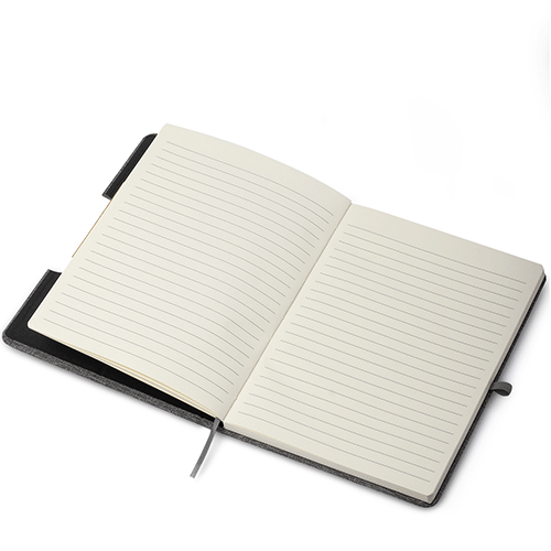 Caderno de anotações com suporte para caneta, fechamento com elástico, capa dura em material reciclável, suporte para celular na capa e miolo com 80 folhas pautadas na cor bege. NÃO ACOMPANHA CANETA.