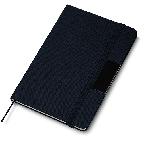 Caderno de anotações com placa de metal para personalização, fechamento em fita elástica, capa dura em material reciclável, miolo com 80 folhas pautadas na cor bege. NÃO ACOMPANHA CANETA.