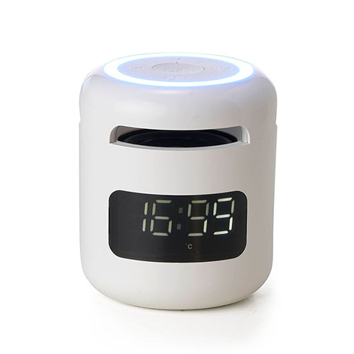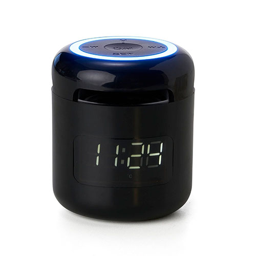 Descrição: Caixa de som multimídia com relógio despertador. Produzida em plástico e com borrachas antiderrapantes na área inferior, a caixa de som tem bateria de longa duração, display de LED na área frontal, e anel de led brilhante na parte superior. A caixa de som executa nos modos bluetooth, rádio FM, cartão TF-microSD e entrada auxiliar P2. Acompanha cabo USB e manual em inglês e chinês.