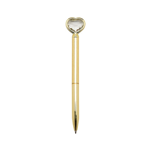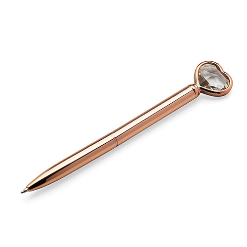 Descrição: Caneta metálica com detalhe de diamante em formato de coração na parte superior, aciona por rotação, carga esferográfica azul.