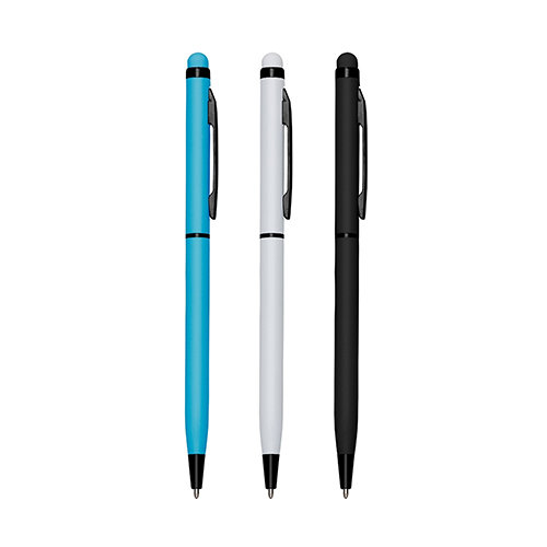 Descrição: Caneta metálica com touch screen, carga esferográfica azul e acionamento por rotação.