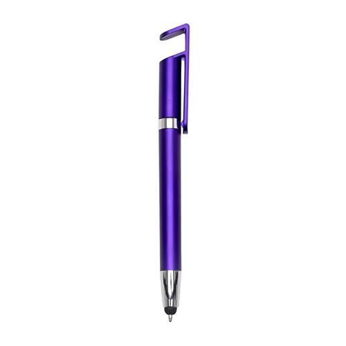 Descrição: Caneta plástica com suporte para celular e ponteira touch screen. Carga esferográfica azul 1.0mm e acionamento por rotação.