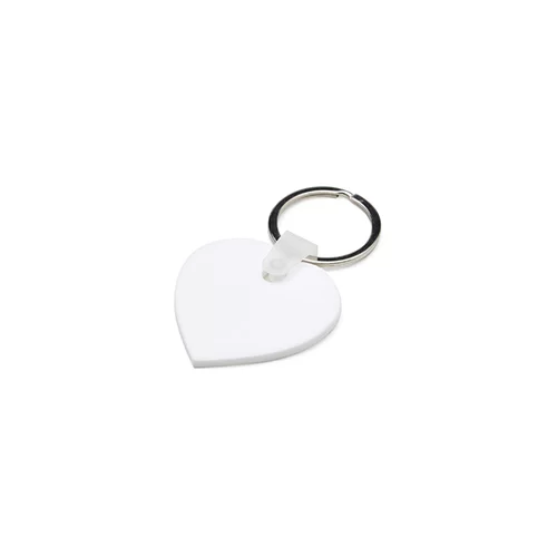 Descrição: Chaveiro de acrílico em formato de coração, frente verso e liso. Possui prendedor de plástico que conecta a argola metálica.