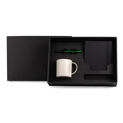 DESCRIÇÃO: Conjunto com caneca, caderneta e caneta.