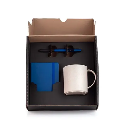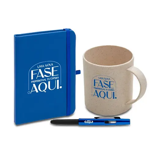 DESCRIÇÃO: Kit composto por caderno para anotações azul com capa dura, caneta esferográfica em ABS azul e caneca em fibra de bambu/PP.