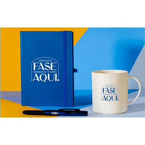 RECOMENDAÇÃO DE PERSONALIZAÇÃO: Uma gravação em Silkscreen na caneca, caderno e caneta.