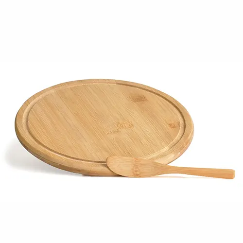 DESCRIÇÃO: Conjunto para petisco em Bambu/Inox. Conta com tábua e espátula em bambu.
