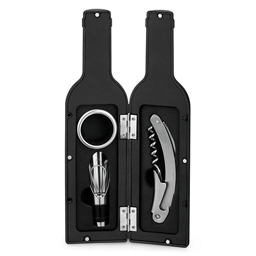 Conjunto para vinho com três componentes em metal: saca-rolhas com canivete de sommelier, gargantilha e salva-gotas com tampa. Fornecido em estojo de oferta em formato de garrafa com acabamento em borracha.