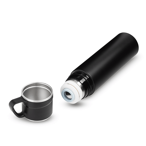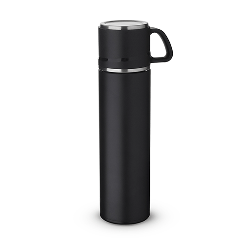 Garrafa térmica em aço inox com parede dupla isolada a vácuo, com capacidade de até 550ml. Tampa removível que possibilita o uso como caneca, anel de silicone para vedação.