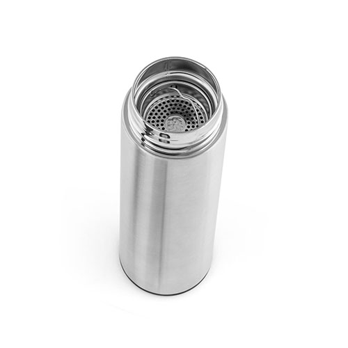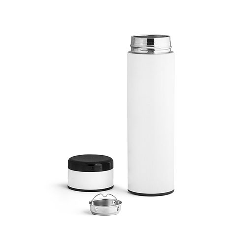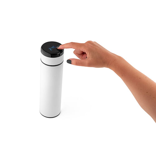Garrafa térmica de 450ml com corpo duplo em aço inox. A tampa tem incorporado um termômetro digital que permite, com um simples toque, saber a temperatura do líquido no interior do termo. Incluso na tampa um sistema de fácil acesso à bateria para substituir quando necessário. Capacidade da bateria: CR2450. Fornecido em caixa presente preta. ø65 x 235 mm | Caixa: 73 x 73 x 270 mm