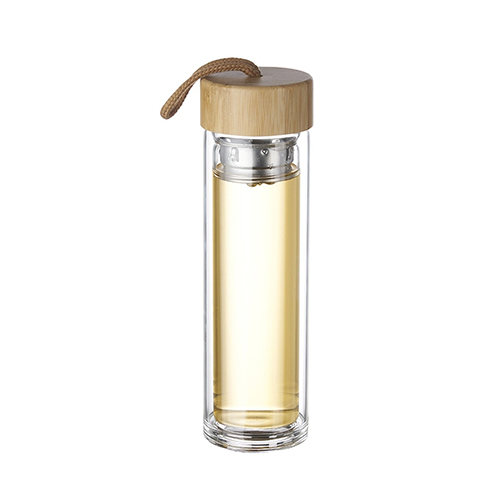 Descrição: Garrafa de vidro 360ml com parede dupla e infusor de metal. Contém tampa rosqueavel de bambu e alça de tecido embutida.