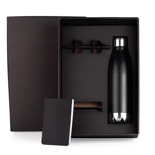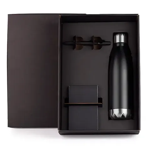 DESCRIÇÃO: Kit de boas vindas. Conta com garrafa em aço Inox preta com tampa rosqueável, bloco para anotações preto e caneta esferográfica em ABS preta.