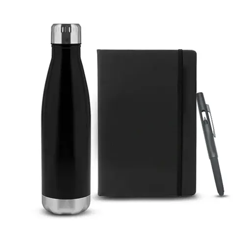 DESCRIÇÃO: Kit composto por garrafa em aço Inox preta com tampa rosqueável, caderno para anotações preto com capa dura e caneta esferográfica em ABS preta.