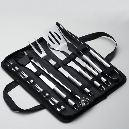 Descrição: Kit Churrasco 17 Peças em estojo de nylon com alça. Possui: pegador, garfo, espátula, faca, pincel, 4 espetos e 8 espetos para petisco em inox, acompanha proteções plásticas e parte interna com velcro para guardar as peças.