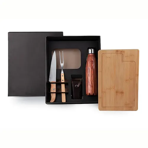 DESCRIÇÃO: Kit churrasco com garrafa e canivete. Conta com tábua para churrasco/cozinha em bambu, garrafa em aço inox com pintura amadeirada, faca 7″ em madeira/inox, garfo trinchante em madeira/inox e canivete.