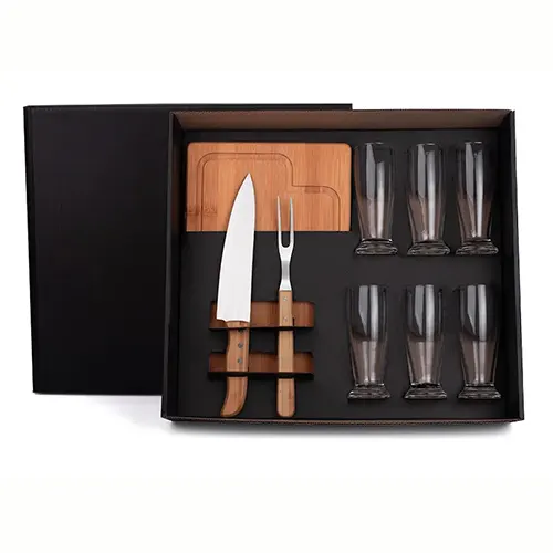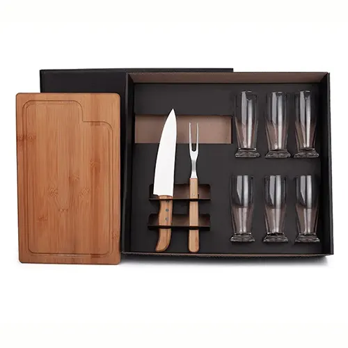 DESCRIÇÃO: Kit churrasco e cerveja. Conta com tábua para churrasco/cozinha em bambu, faca para cozinha em Bambu/Inox 8″, garfo trinchante em bambu/inox e 6 copo de vidro para Cerveja/Drinks.