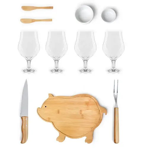 DESCRIÇÃO: Kit churrasco, petisco e cerveja. Conta com tábua em bambu com formato de porco e duas espátulas de 14 cm; faca 7″ e garfo trinchante em bambu/inox; 2 ramekins em porcelana e quatro taças para cerveja/drink .