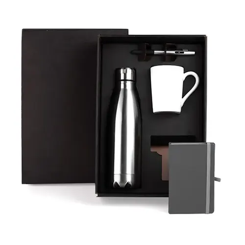 DESCRIÇÃO: Conta com garrafa de 750 ml em aço Inox na cor prata, caneca em cerâmica branca com capacidade de 230 ml, caderno para anotações cinza com capa dura e caneta esferográfica em ABS prata.