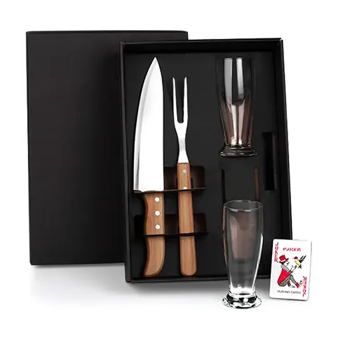 DESCRIÇÃO: Kit de copos e facas. Conta com dois copos de vidro para cerveja/drinks; faca 8″ e garfo trinchante em bambu/inox; jogo de baralho. Capacidade: 200ml cada copo.