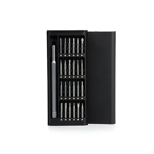 Descrição: Kit ferramenta com 25 peças em estojo plástico com tampa de encaixe. Contém: 1 chave extensora rotatória para conexão das ponteiras, 1 ponteira Tri-Wing, 5 ponteiras Phillips, 4 ponteiras fenda, 10 ponteiras Torx, 2 ponteira Allen, 1 ponteira spanner e 1 ponteira fenda triangular.