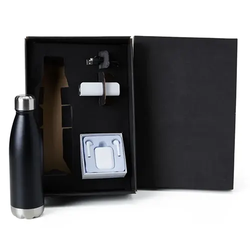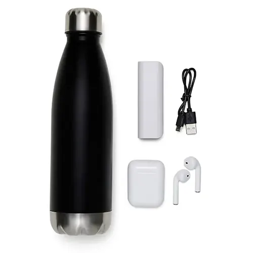 DESCRIÇÃO: Conta com fone de ouvido bluetooth com comandos touch, microfone, carregador de fechamento magnético e acompanha USB Lightning para carrega; Garrafa em aço Inox preta com tampa rosqueável com capacidade total de 750ml e garregador portátil USB em Plástico ABS para celular/smartphone/tablet.