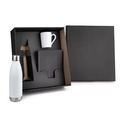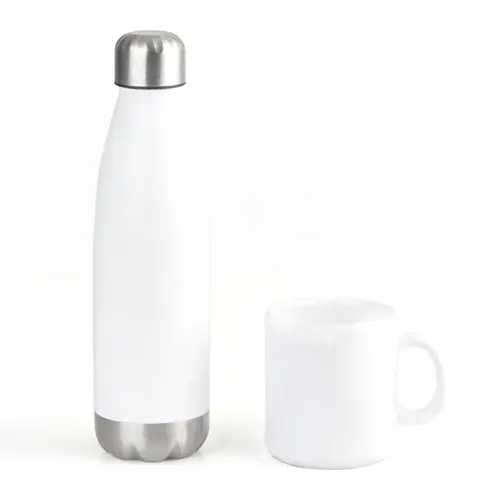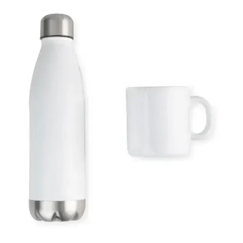 DESCRIÇÃO: Kit garrafa e caneca. Conta com garrafa em aço inox branca com tampa rosqueável e caneca em cerâmica branca.