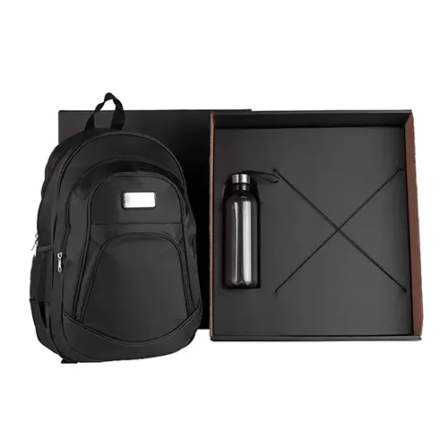 DESCRIÇÃO: Kit composto por mochila preta em Poliester 600D/1680D que contém alças para as costas, alça para as mãos, compartimento para notebook de até 15″, 3 bolsos externos com zíper e 2 bolsos externos em tela. Conta também com garrafa preta em PET.