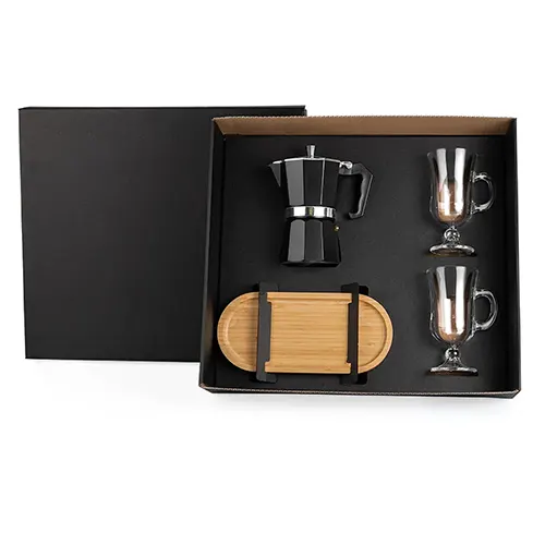 DESCRIÇÃO: Kit para café. Conta com cafeteira em alumínio; bandeja em bambu; duas canecas em vidro 240ml cada.