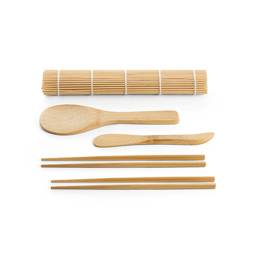 Kit para Sushi SP94314 Kit para sushi em bambu com tapete, 2 pares de hashi, 1 colher e 1 faca em bambu. Fornecido em caixa presente de papel kraft. Caixa: 245 x 100 x 33 mm