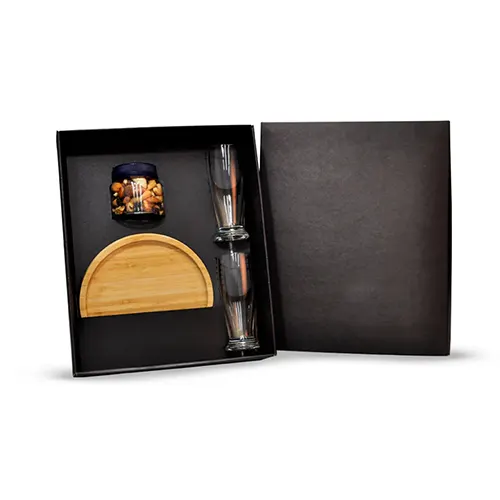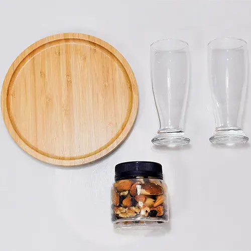 DESCRIÇÃO: Kit petisco com caneca e mix de castanhas. Conta com petisqueira redonda em bambu; dois copos para cerveja em vidro; mix de castanhas e frutas secas 150g.