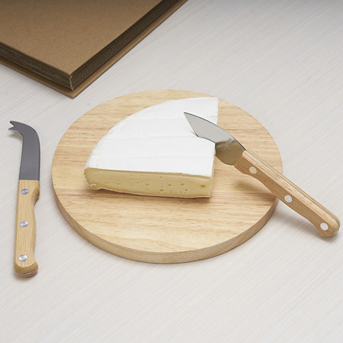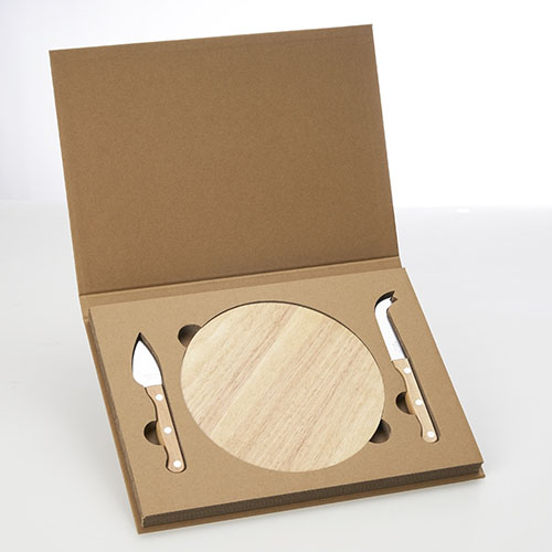 Descrição: Kit queijo 3 peças em estojo kraft . Contém faca com ponta, faca reta e tábua. Acompanha embalagem de papelão.