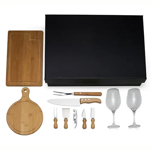 DESCRIÇÃO: Conta com tábua para Churrasco e tábua para frios em Bambu; Duas facas, uma espátula e um garfo para Queijo; Faca 8″ e garfo em Bambu/Inox; Abridor de Vinho em Inox; 2 taças em vidro.