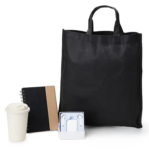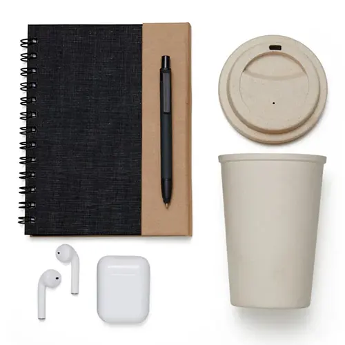 DESCRIÇÃO: Esse kit conta com sacola preta em TNT com alças, caderno espiral preto/bege com capa e caneta em papelão reciclado rígido, copo em Fibra de Bambu / PP; fone de ouvido bluetooth com comandos touch, microfone, carregador de fechamento magnético e acompanha USB Lightning para carrega.
