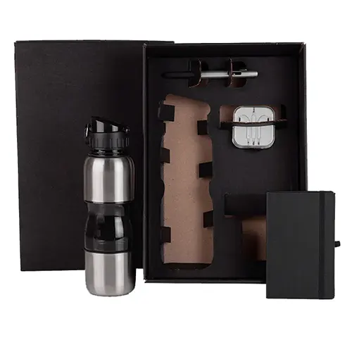 DESCRIÇÃO: Conta com squeeze em Aço Inox 750ml; caneta em plástico ABS prata; caderno com pauta; fone de ouvido.