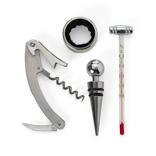 Descrição: Kit vinho 4 peças com estojo, parte interna revestida de espuma. Possui tampa de bico, saca rolha, termômetro e wine collar.