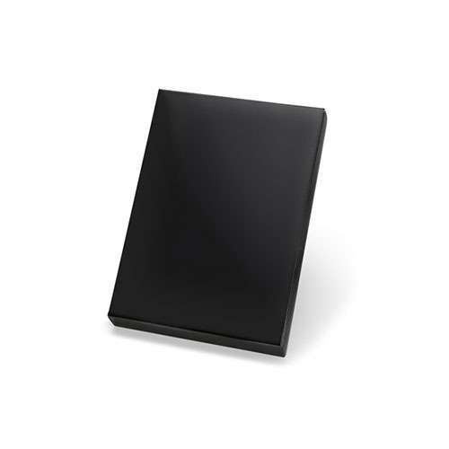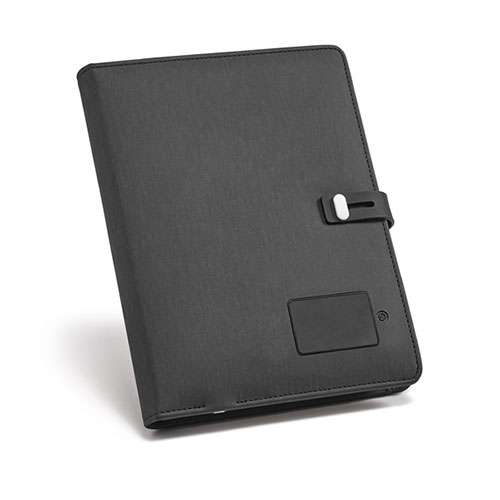 Pasta A5. C. sintético. Bateria portátil embutida (lítio). Capacidade: 4.000 mAh. Tempo de vida ≥ 500 ciclos. Com entrada/saída 5V/1A e cabo USB/micro USB para carregar a bateria. Caderno removível: 64 folhas pautadas cor marfim. Elásticos interiores para organização e suporte para smartphone. Placa com acabamento em borracha, LED interior e botão on/off. Fornecida em caixa presente. Esferográfica não inclusa. 165 x 225 x 25 mm | Placa: 55 x 35 mm | Caixa: 180 x 240 x 35 mm