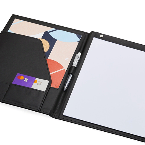 Descrição: Pasta convenção de couro sintético, possui porta caneta, compartimento para arquivar documentos, dois bolsos para cartões e um bloco com aproximadamente 25 folhas brancas não pautadas.