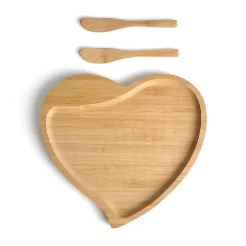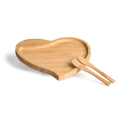 DESCRIÇÃO: Petisqueira em bambu com formato de coração e duas espátulas de 14 cm.