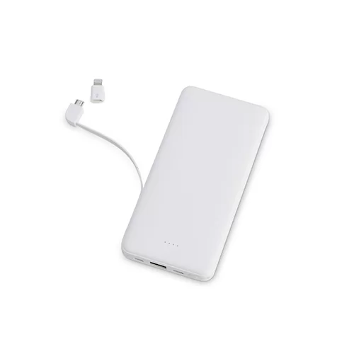 Descrição: Power bank plástico de 10.000mAh com indicadores led de bateria e cabos acoplados: Tipo-C e V8. Acompanha cabo USB V8 e adaptador Lightning.