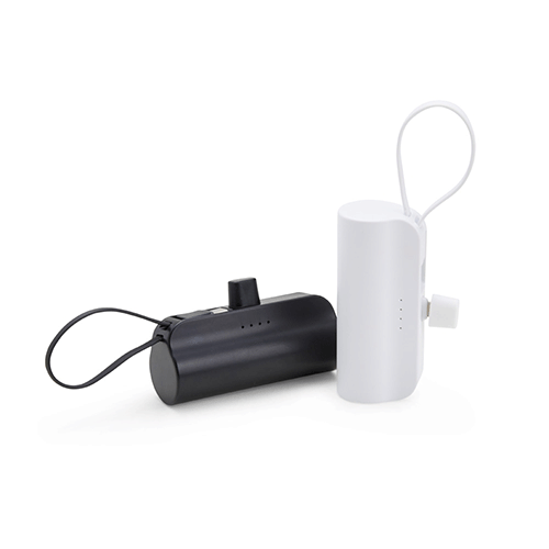 Descrição: Power bank 5.000mAh plástico com indicadores de bateria em LED, contém haste de suporte para celulares com a entrada Lightning e cabo tipo-C acoplado. Acompanha cabo USB Tipo-C.
