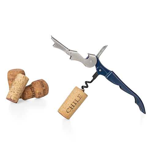 Descrição: Saca rolhas metálico de 2 estágios com acabamento fosco. Contém abridor de garrafa, lâmina de corte e saca rolhas.